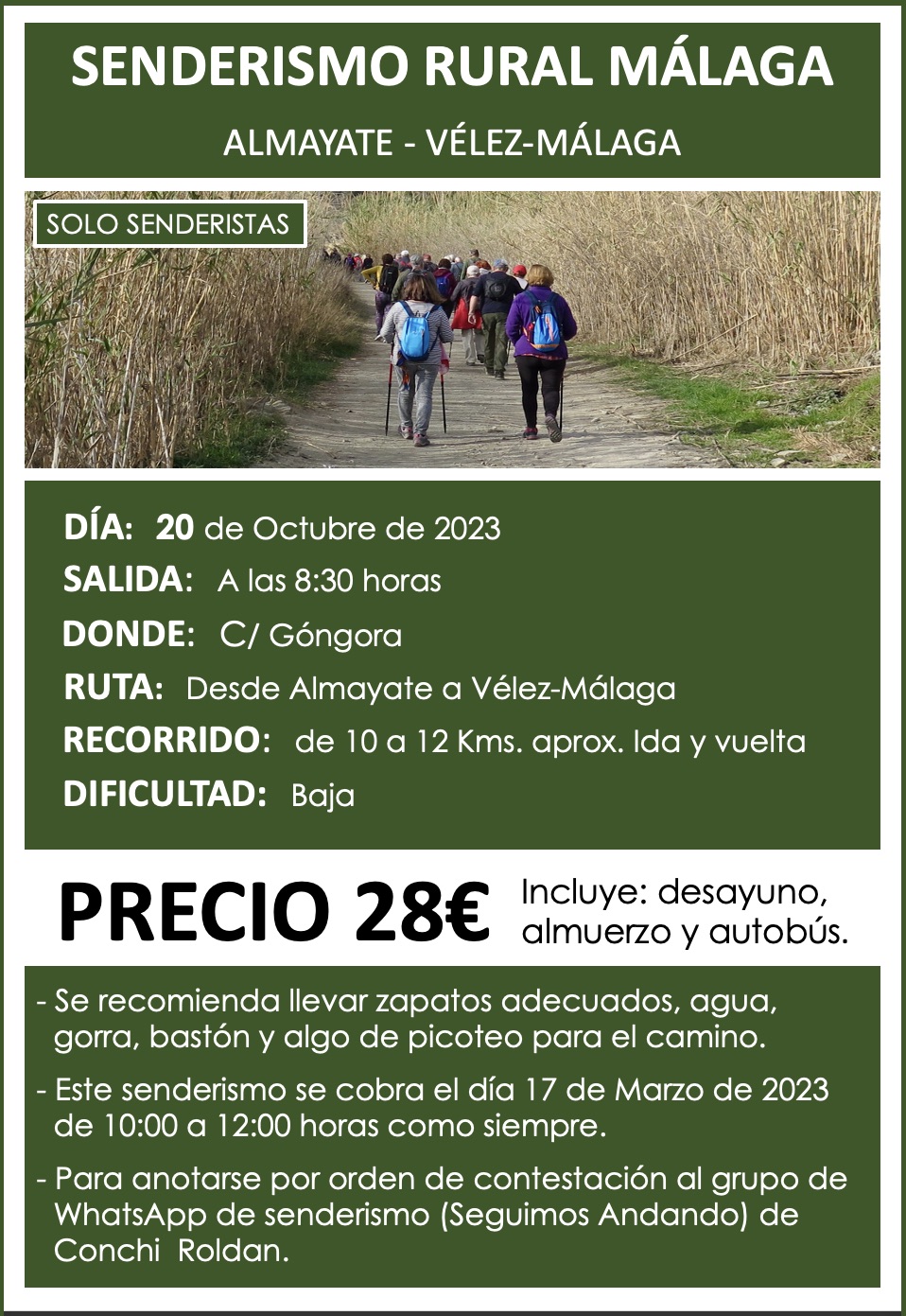 El próximo día 20 de octubre de 2023, haremos una nueva ruta de senderismo desde Almayate hasta Vélez-Málaga. Post Views: 964 Navegación de entradas Senderismo. Ruta desde el Museo de Málaga hasta Gibralfaro Senderismo. Ruta desde C/ Góngora – Pantano El Limonero