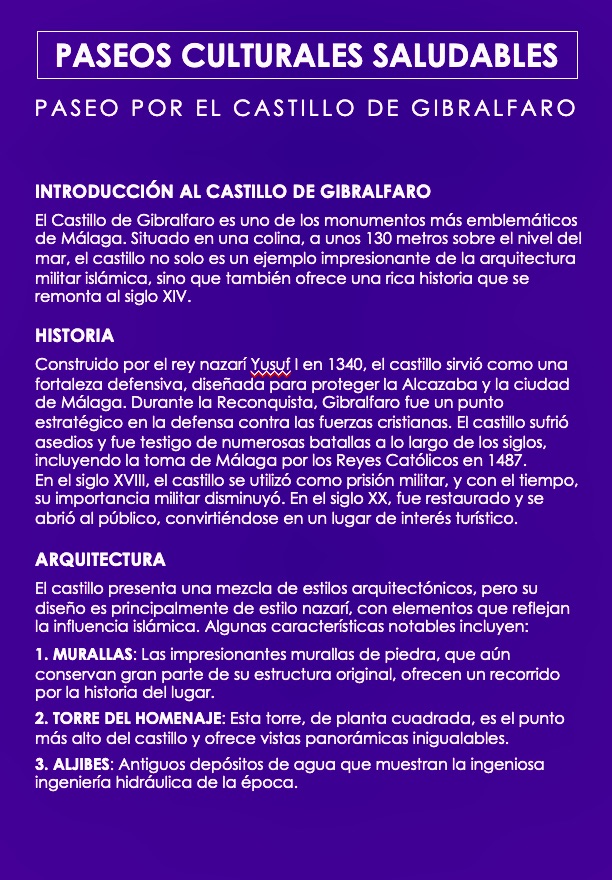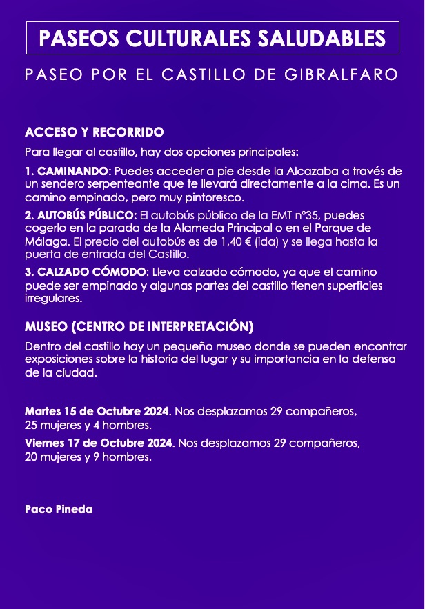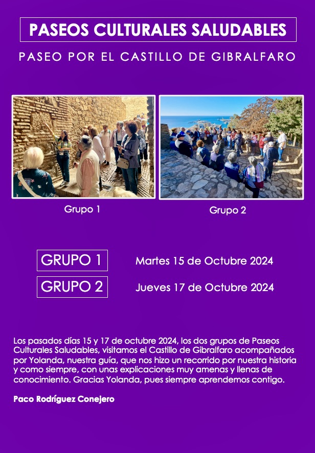 Los pasados días 15 y 17 de octubre 2024, los grupos 1 y 2 de Paseos Culturales saludables, visitaron el Castillo de Gibralfaro…