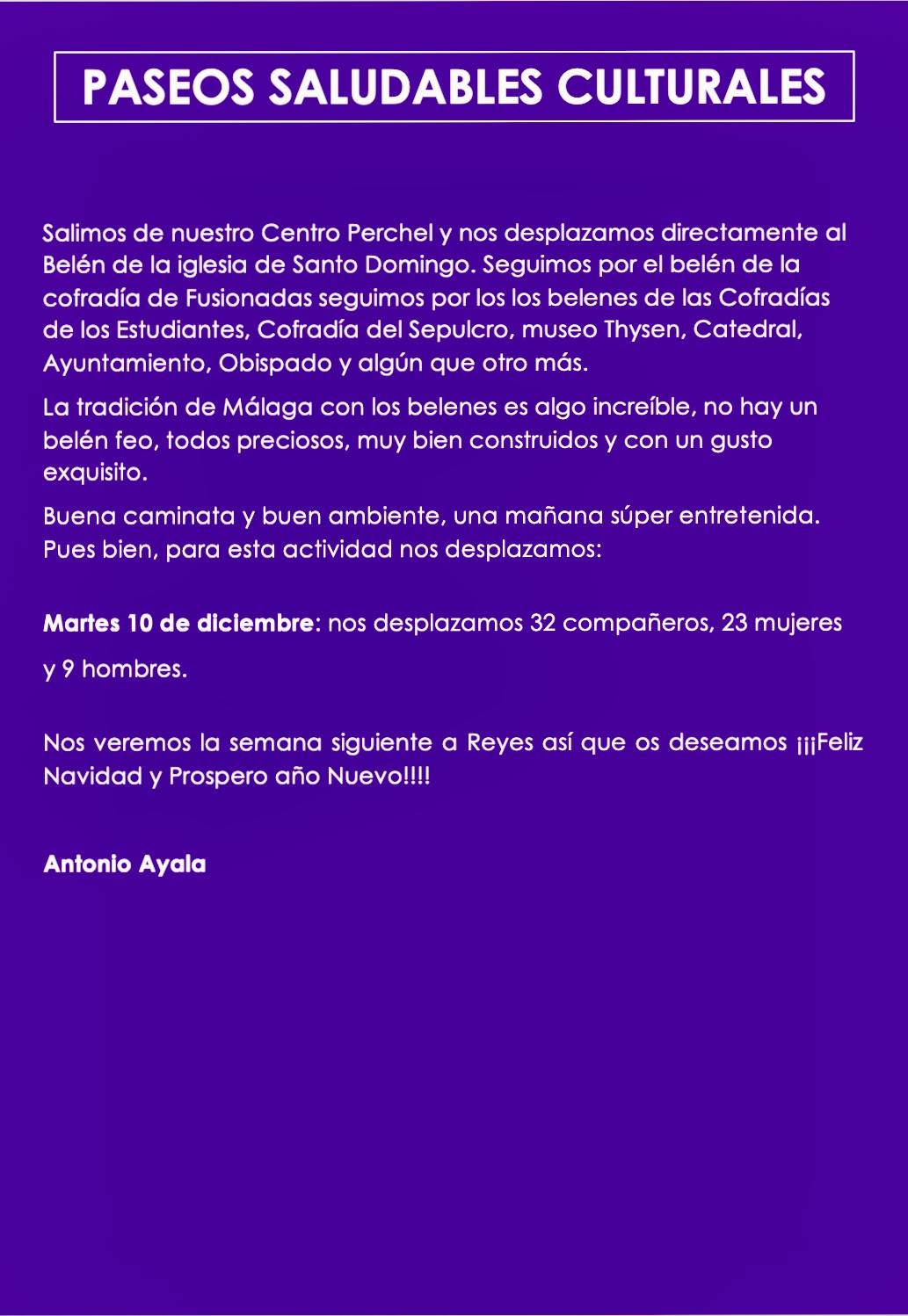 El día 10 de diciembre 2024 el grupo 1 de Paseos Saludables Culturales fue a visitar los belenes… FOTOS Antonio Ayala Post Views: 738 Navegación de entradas Visita al museo MUPAM (Visita y Fotos) Museo de la Asociación de Cofradías de Málaga