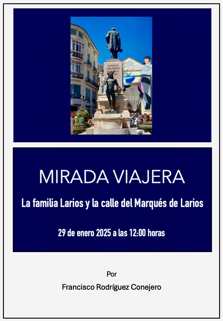El próximo miércoles 29 de enero de 2025 a las 12:00 horas, Francisco Rodríguez Conejero, responsable de este taller, nos hablará del siguiente tema: La familia Larios y la calle Marqués de Larios.