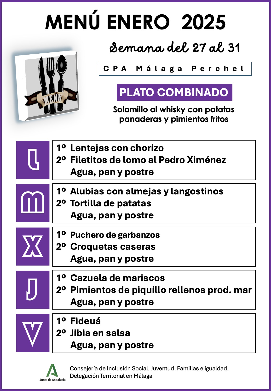 Menú correspondiente a la semana del día 27 al 31 de Enero 2025. Para mas información pinche sobre COMEDOR Post Views: 602 Navegación de entradas Menú semanal del 20 al 24 de Enero 2025 Menú semanal 3 al 7 de Febrero 2025