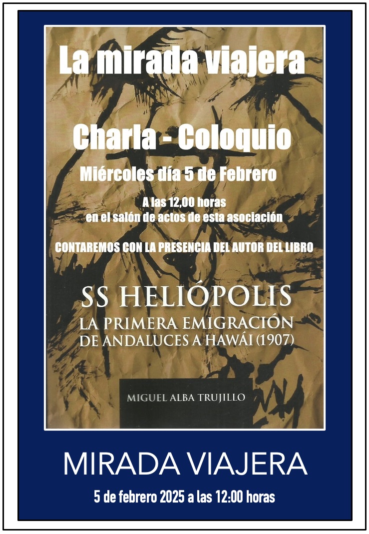 El próximo miércoles 5 de febrero de 2025 a las 12:00 horas, el escritor malagueño Miguel Alba Trujillo, nos hablará de su libro SS HELIÓPOLIS LA PRIMERA EMIGRACIÓN DE ANDALUCES A HAWÁI (1907)