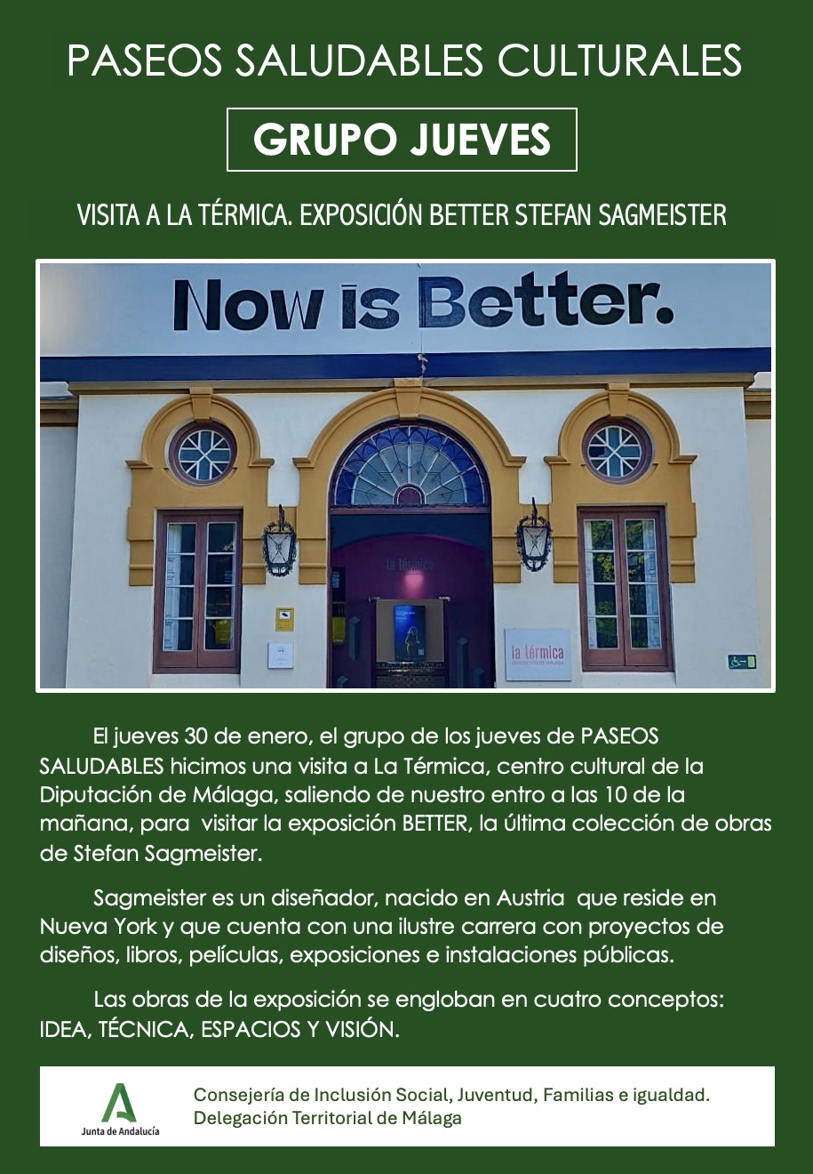 El jueves 30 de enero, el grupo de los jueves de Paseos Saludables hicimos una visita a La Térmica, centro cultural de la Diputación de Málaga, saliendo de nuestro entro a las 10 de la mañana, para visitar la exposición Better…