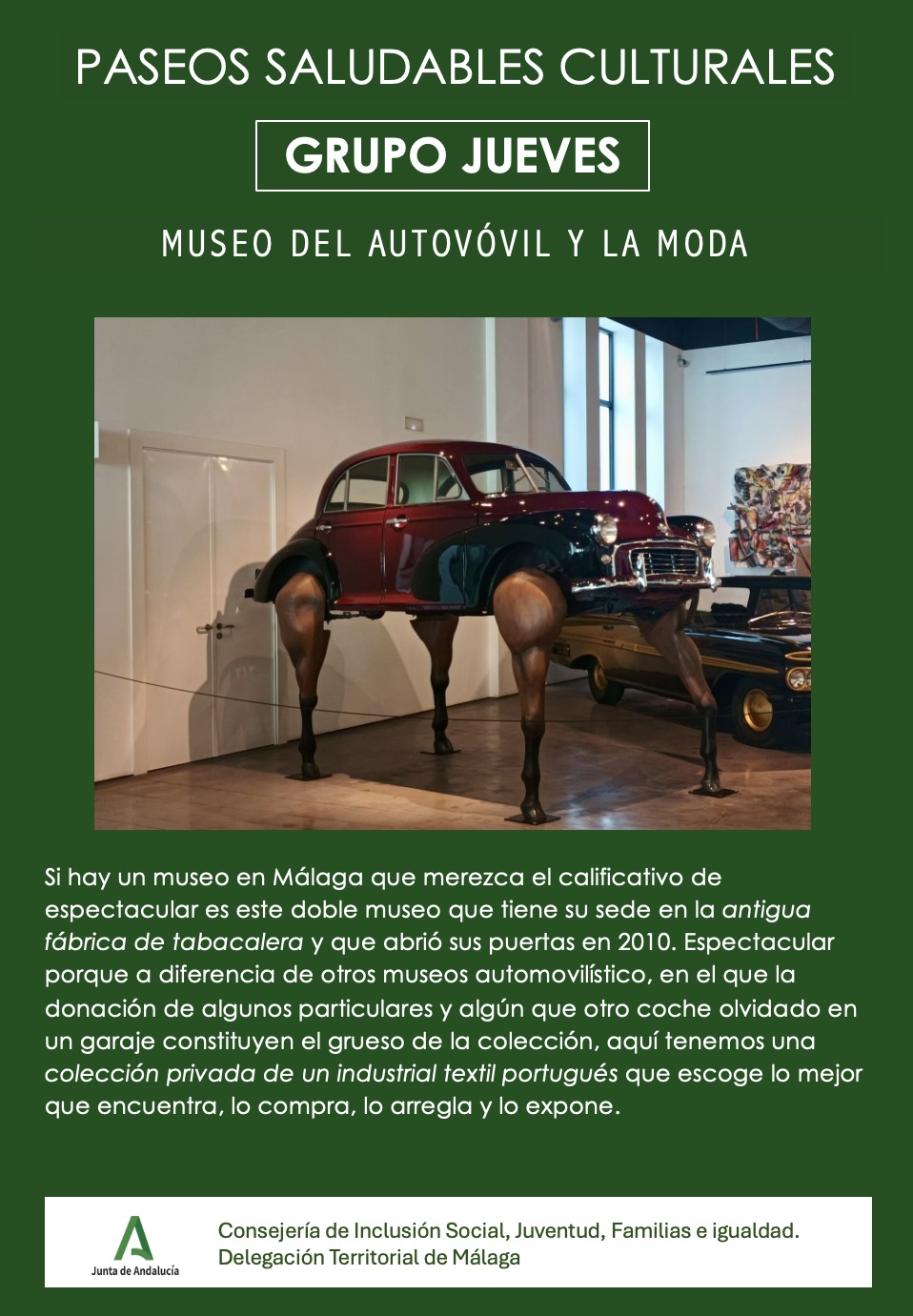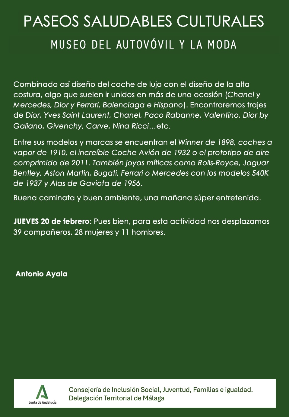El pasado jueves 20 de febrero 2025, el grupo de los jueves de Paseos Saludables Culturales visitó el Museo del Automóvil y La Moda de Málaga…