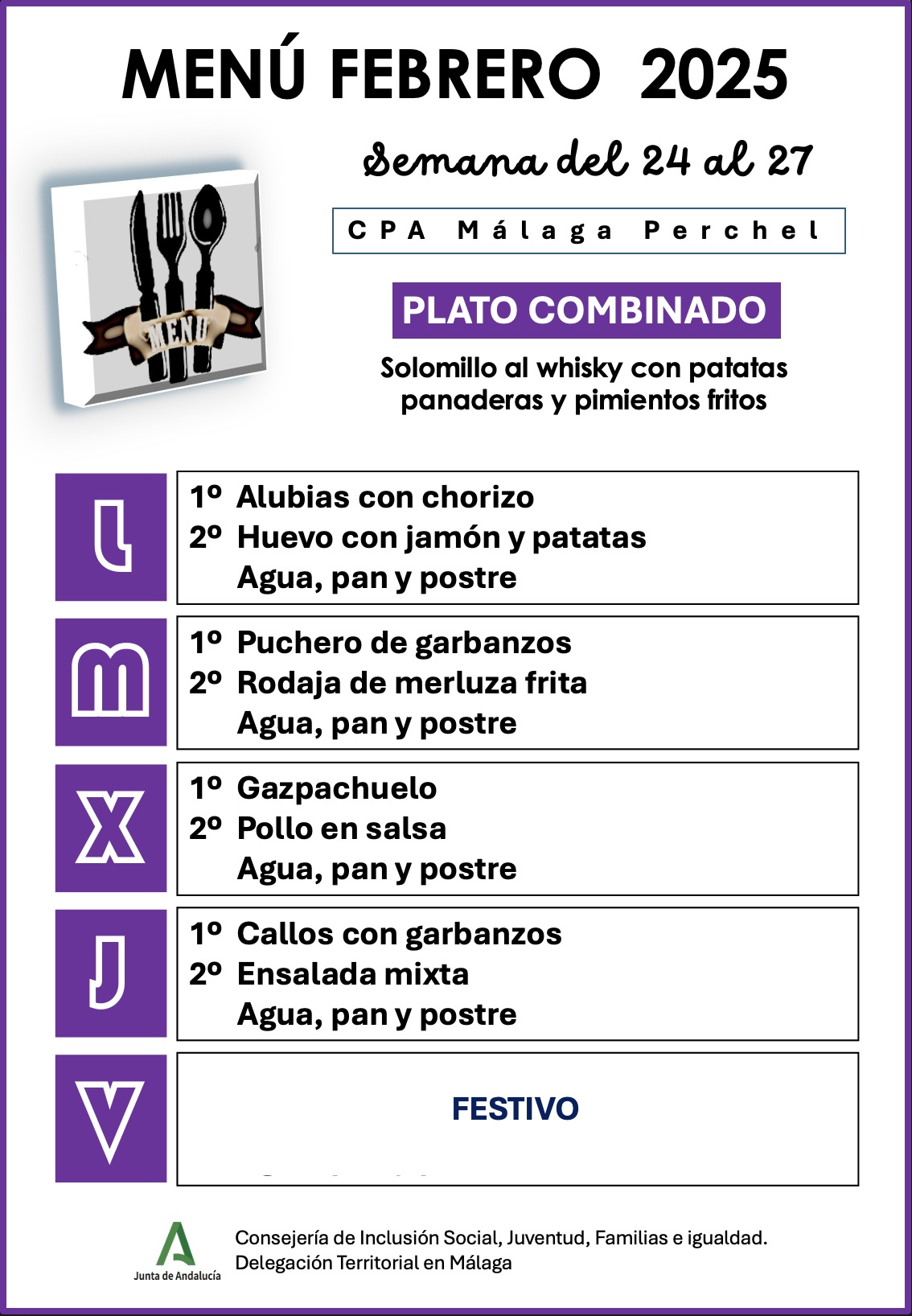 Menú correspondiente a la semana del día 24 al 27 de Febrero 2025. Para mas información pinche sobre COMEDOR Post Views: 486 Navegación de entradas Menú semanal del 17 al 21 febrero 2025 Menú semanal del 3 al 7 de Marzo 2025