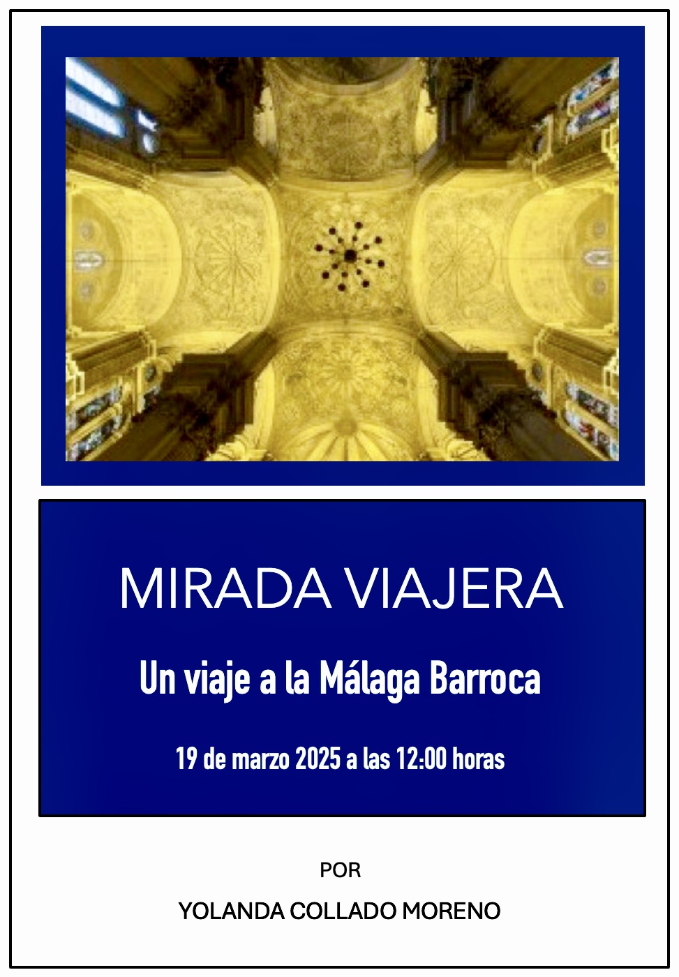 El próximo miércoles 19 de marzo de 2025 a las 12:00 horas, Yolanda Collado Moreno, Doctora en Arqueología, Historia y Arte por la Universidad de Granada, nos hablará del siguiente tema: Un viaje a la Málaga Barroca.