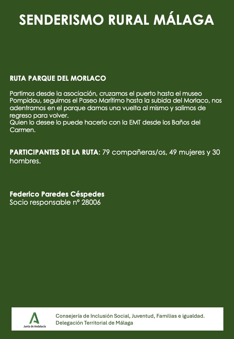 Partimos desde la asociación, cruzamos el puerto hasta el museo Pompidou, seguimos el Paseo Marítimo hasta la subida del Morlaco, nos adentramos en el parque damos una vuelta al mismo y…