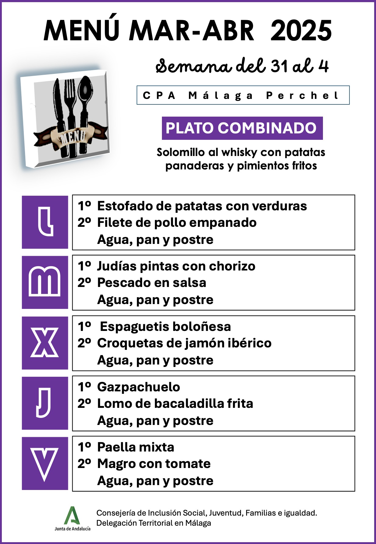 Menú correspondiente a la semana del día 31 de marzo al 4 de abril 2025. Para mas información pinche sobre COMEDOR Post Views: 563 Navegación de entradas Menú semanal del 24 al 28 de Marzo 2025 Menú semanal del 7 al 11 de Abril 2025