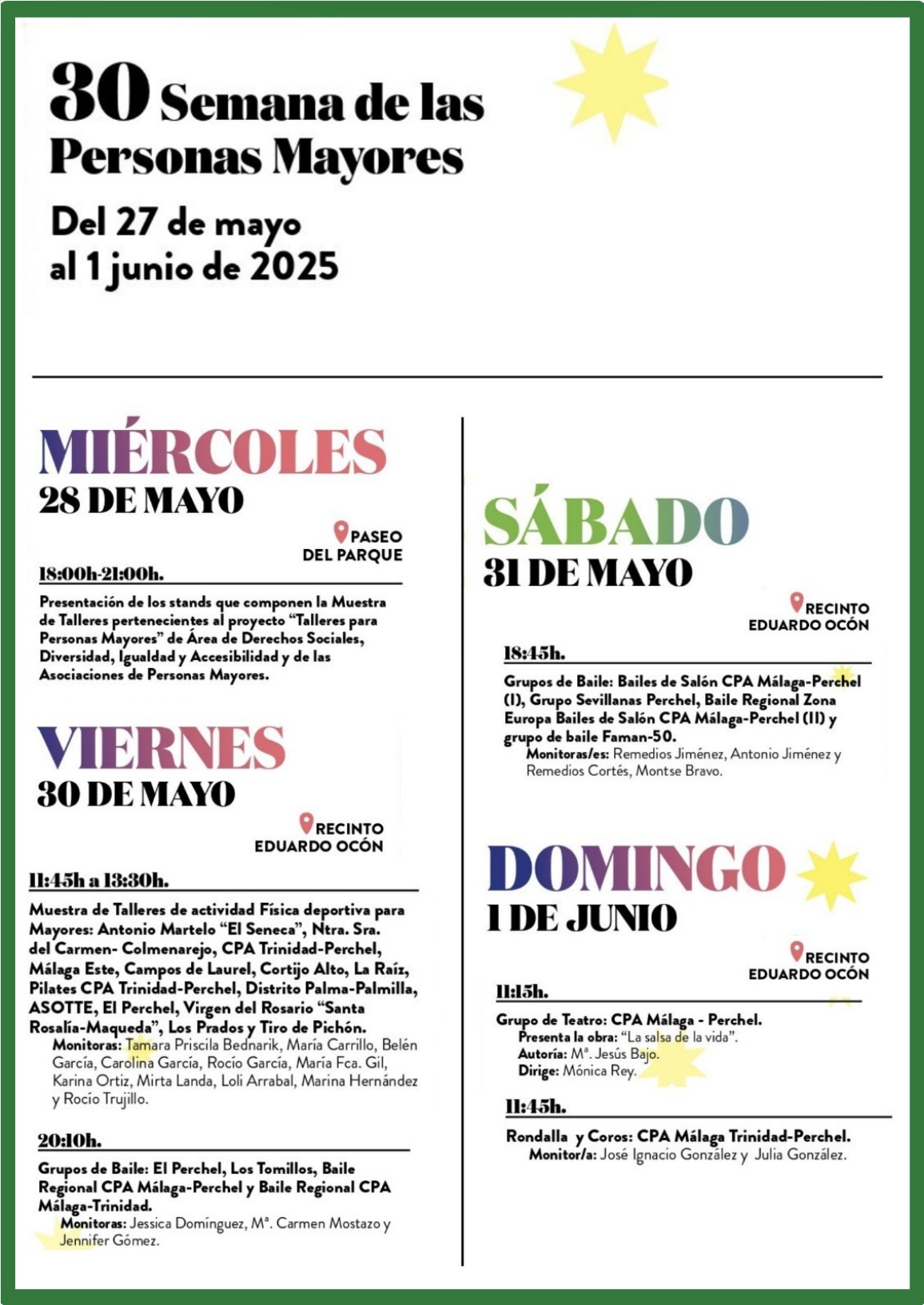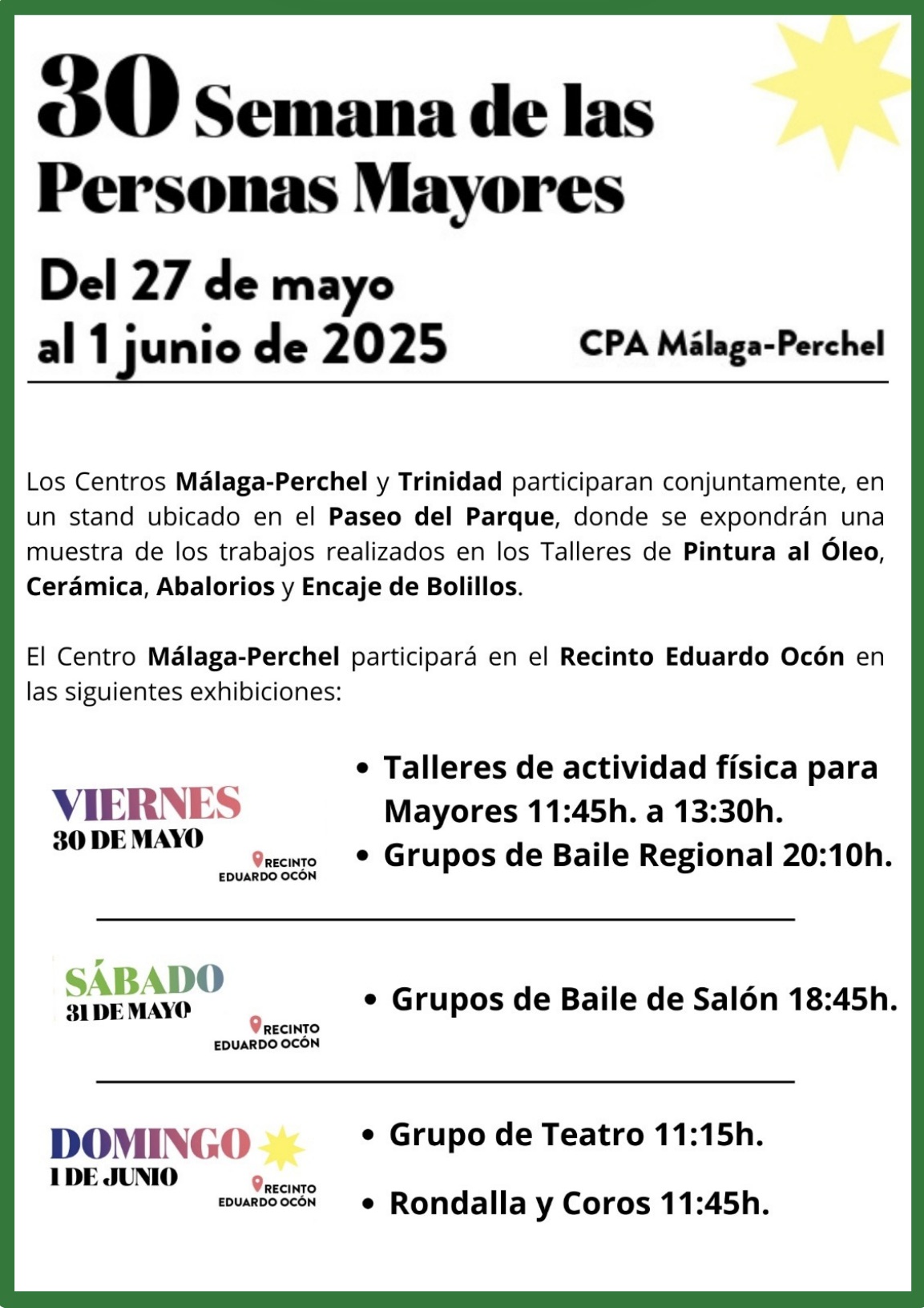 Desde el 27 de mayo al 1 de junio de 2025 se celebrará en la Plaza de la Constitución, Paseo del Parque y Recinto Eduardo Ocón, la 30 Semana de las Personas Mayores…