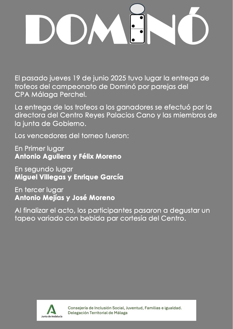 El pasado día 19 de junio 2025 se entregaron los trofeos del campeonato de Dominó por parejas celebrado en nuestro Centro,,,