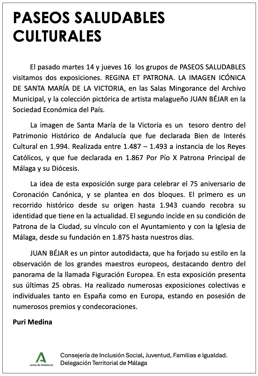 El pasado martes 14 y jueves 16 los grupos de PASEOS SALUDABLES CULTURALES visitamos dos exposiciones. REGINA ET PATRONA. LA IMAGEN ICÓNICA…