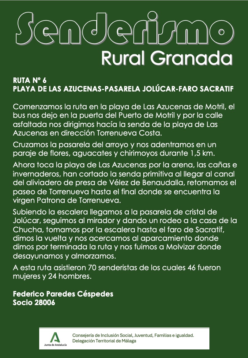 El pasado 24 de octubre 2025, el grupo de Senderismo organizó una nueva ruta: Paseo de Torrenueva Costa a la pasarela de Jolúcar y faro Sacratif en la localidad de Torrenueva (Granada).