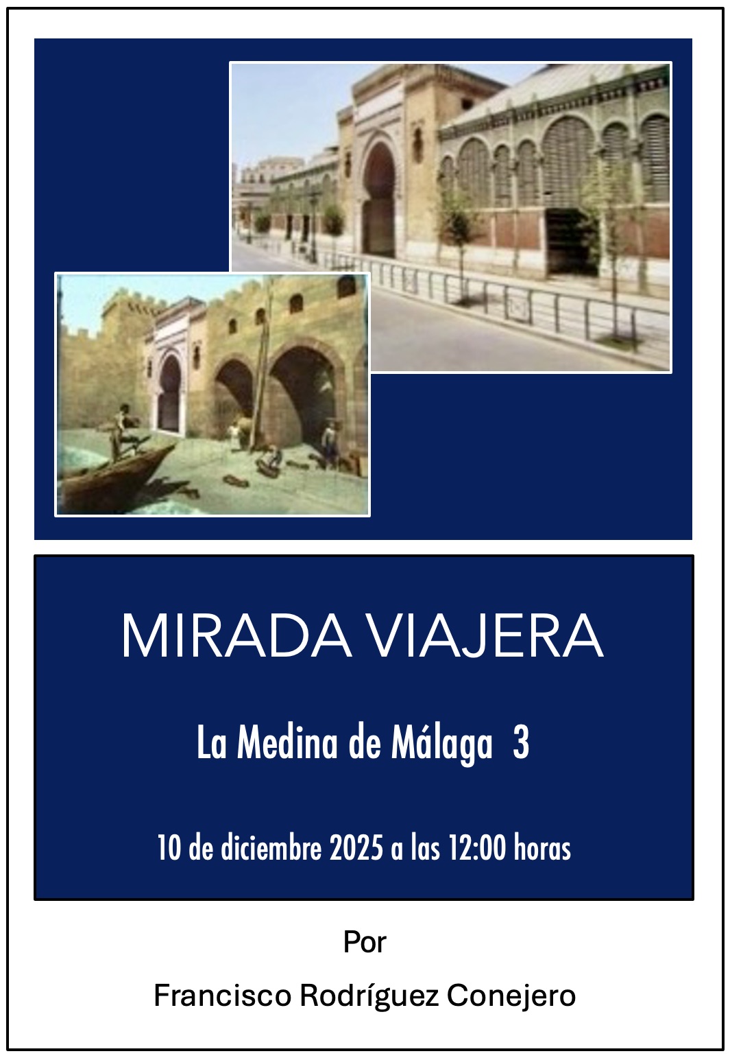 El próximo miércoles 10 de diciembre de 2025 a las 12:00 horas, Francisco Rodríguez Conejero, responsable de este taller, nos hablará del siguiente tema: La Medina de Málaga 3.