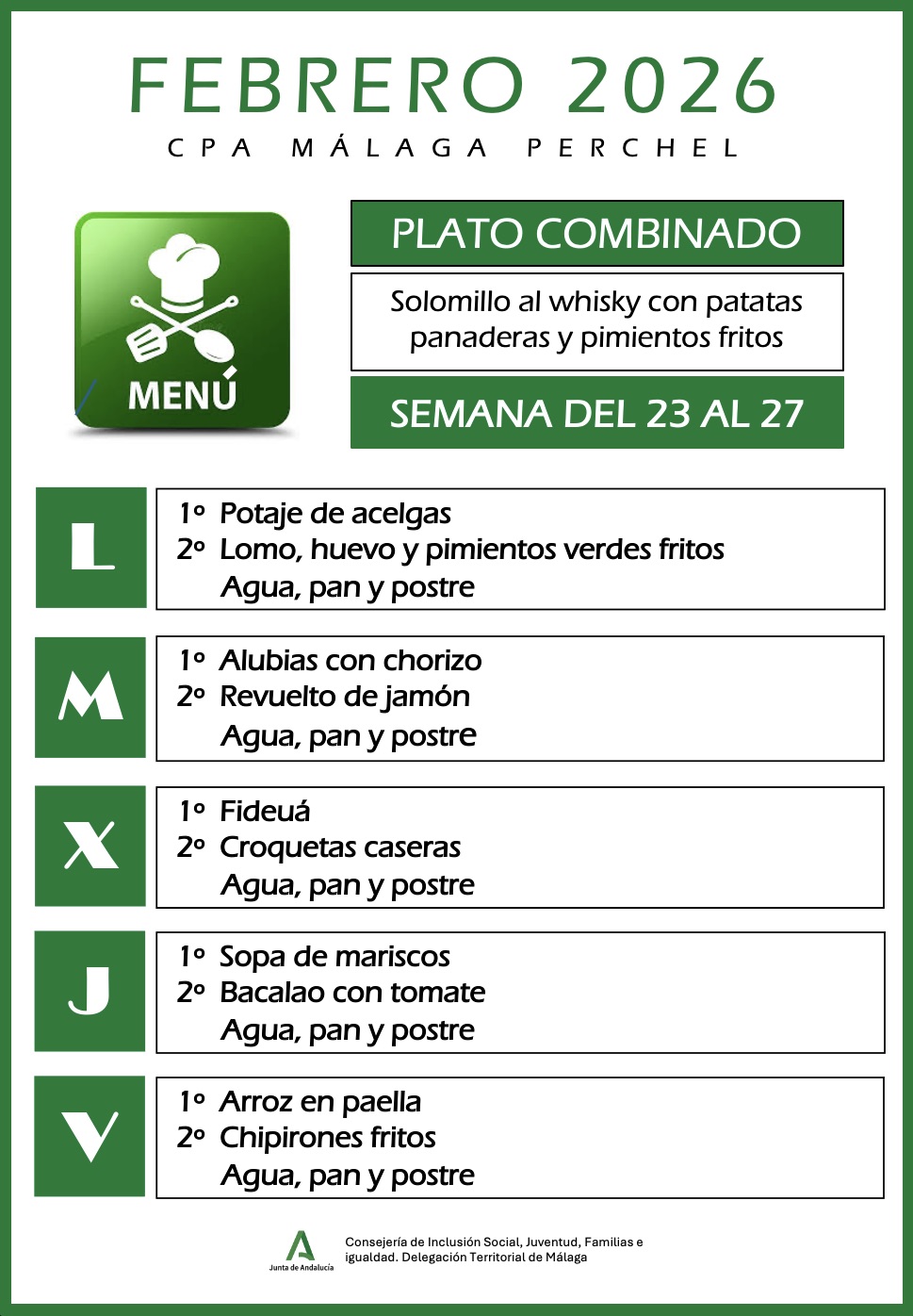 Menú correspondiente a la semana del 23 al 27 de Febrero de 2026. Para mas información pinche sobre COMEDOR Post Views: 23 Navegación de entradas Menú semanal del 16 al 20 de febrero 2026