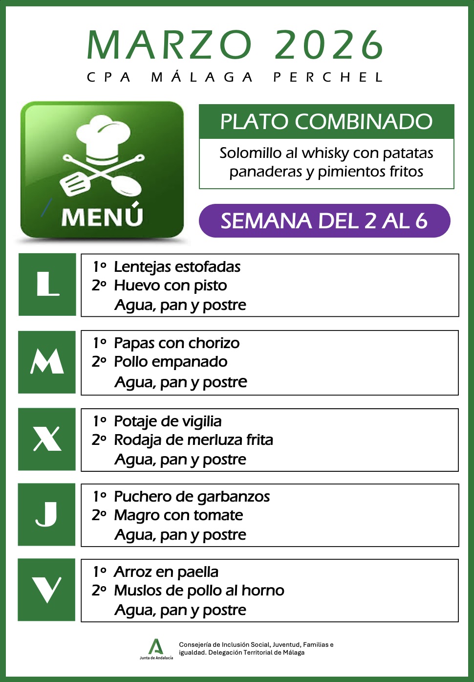 Menú correspondiente a la semana del 2 al 6 de Marzo de 2026. Para mas información pinche sobre COMEDOR Post Views: 21 Navegación de entradas Menú semanal del 23 al 27 de febrero 2026