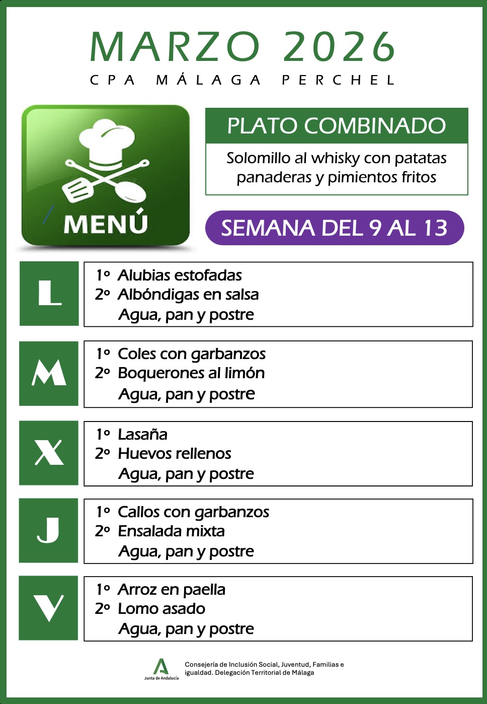 Menú correspondiente a la semana del 9 al 13 de Marzo de 2026. Para mas información pinche sobre COMEDOR Post Views: 57 Navegación de entradas Menú semanal del 2 al 6 de Marzo 2026
