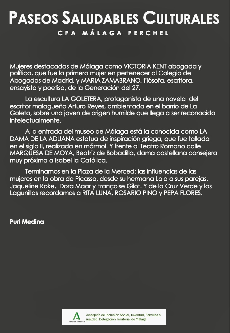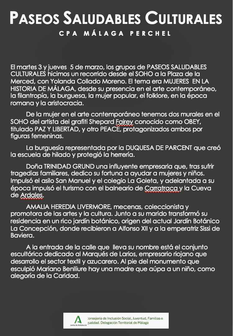 El martes 3 y jueves 5 de marzo 2026, los grupos de PASEOS SALUDABLES CULTURALES hicimos un recorrido desde el SOHO a la Plaza de la Merced, con nuestra guía, historiadora y arqueóloga, Yolanda Collado Moreno. El tema era MUJERES EN LA HISTORIA DE MÁLAGA…