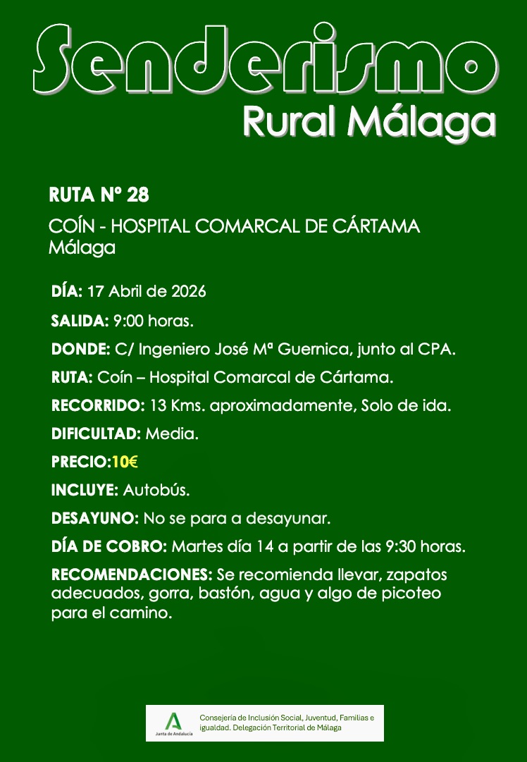 El próximo 17 de abril 2026, el grupo de Senderismo ha organizado una nueva ruta, Coín al Hospital Comarcal de Cártama… Post Views: 14 Navegación de entradas Información. Ruta Fuentes y Nacimiento de Cuevas del Becerro